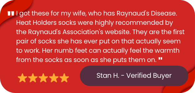"My wife has Raynaud's Syndrome, which causes her fingers and toes to feel numb in cold weather. These socks have been a god sent for her. Planning on getting more, great product." - Robert C.