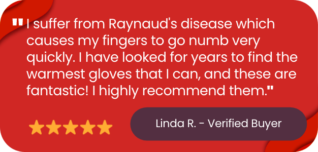 "I have Raynaud's Syndrome and live in Buffalo, NY. I am constantly battling to keep my fingers warm during the winter months. These gloves are fantastic and I would recommend them to anyone! They are very cozy and definitely keep my fingers and hands from becoming icicles!!" - Arlene H.