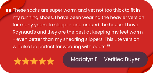 "As a Raynaud's sufferer, I struggle to keep my hands and feet warm enough in the cold Minnesota winters. These socks were amazing! They are big and thick, so not really anything you'd wear around the house, but super warm in my boots! Thanks so much for being Raynaud's-friendly!!" - Amanda A.